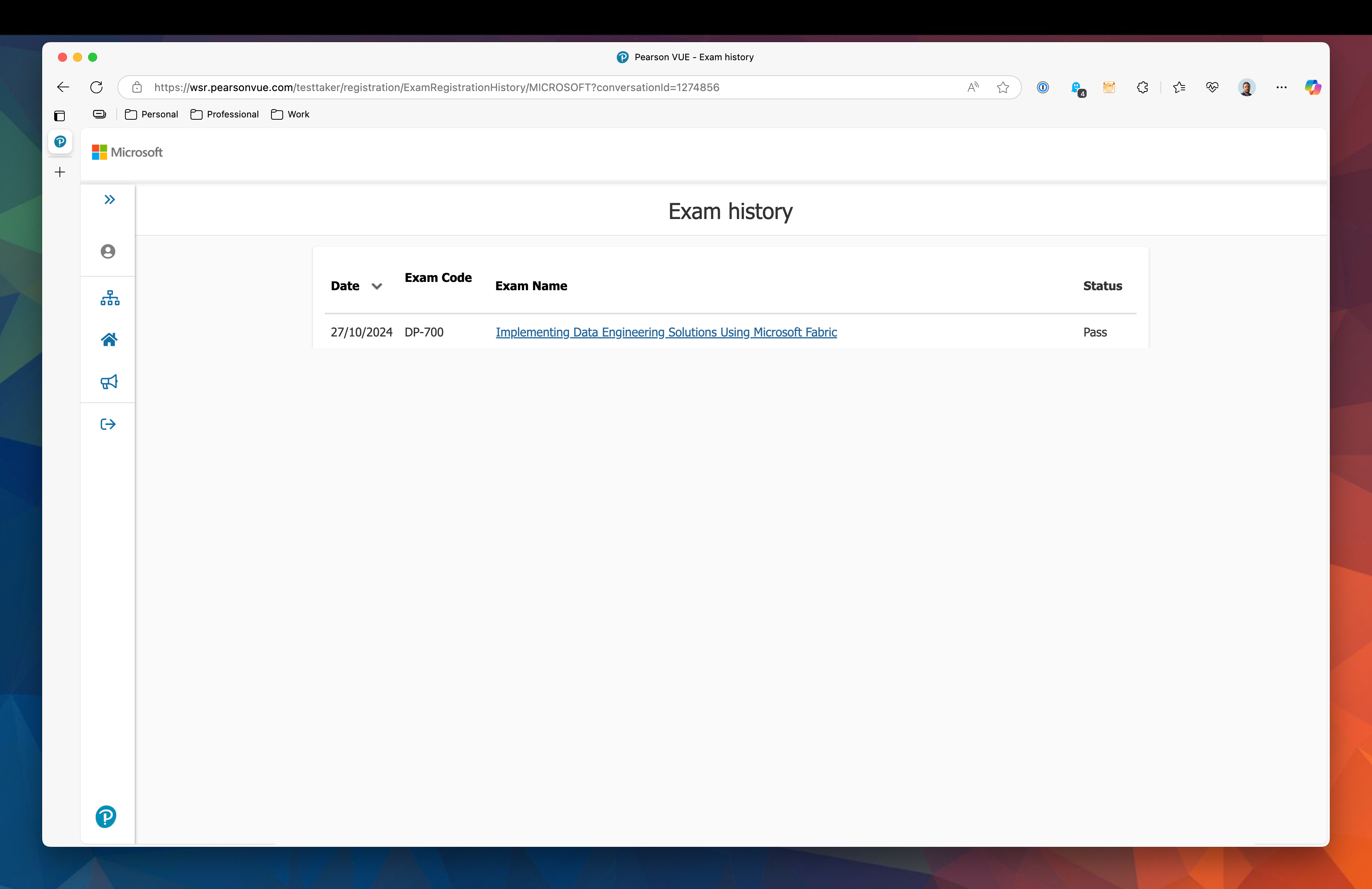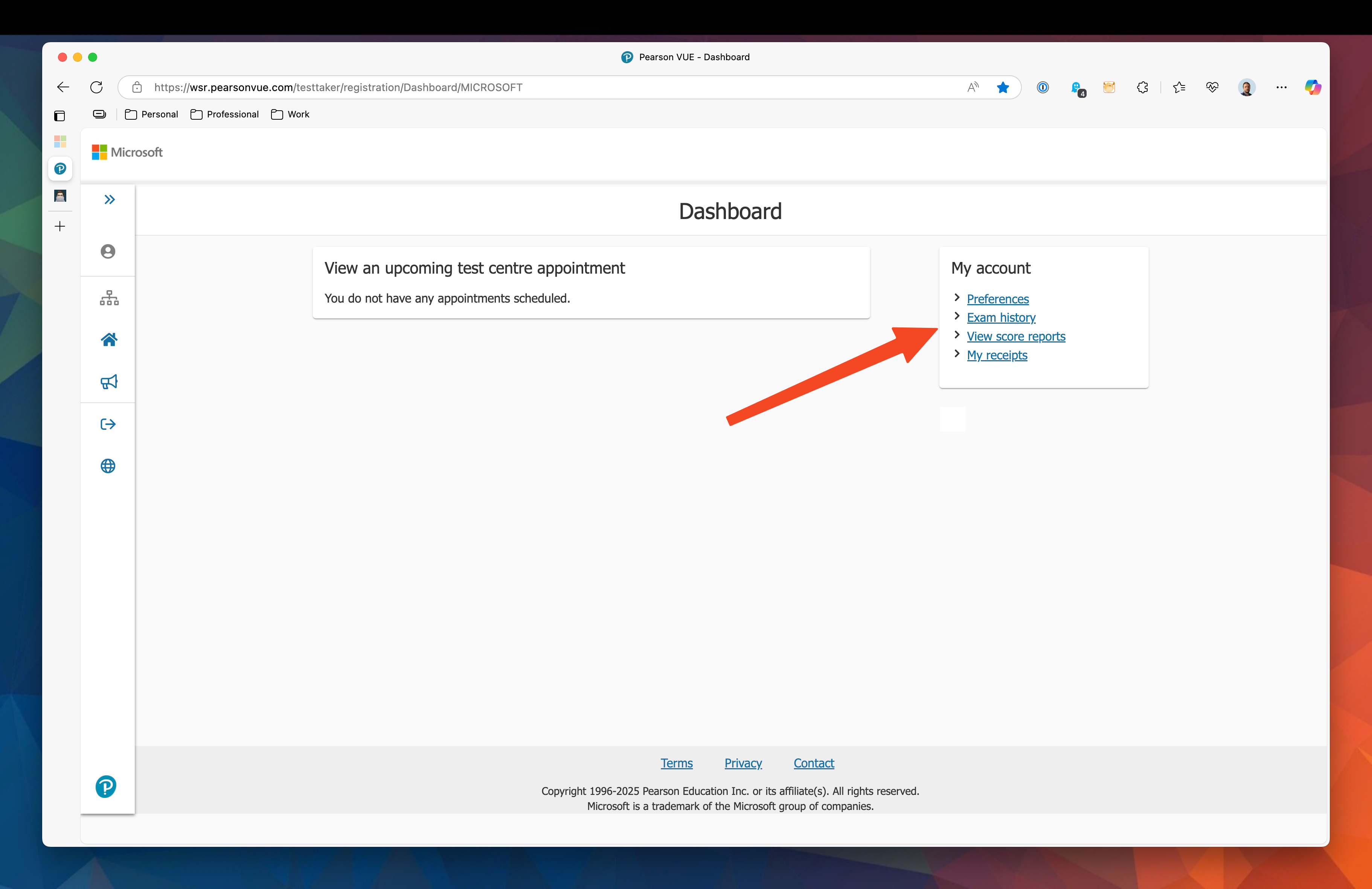 Typically, you receive an email 1-2 weeks after launch but I didn’t receive one. You can however, find out the result through a bit of a convoluted process via the Pearson Vue website. We need to visit the Pearson VUE with my Microsoft profile. The handoff for this seems to be between Microsoft Learn and Pearson VUE. I don’t seem to have found a way to do this directly on the Pearson VUE site, the only way I have found to do this is by attempting to schedule a new exam.